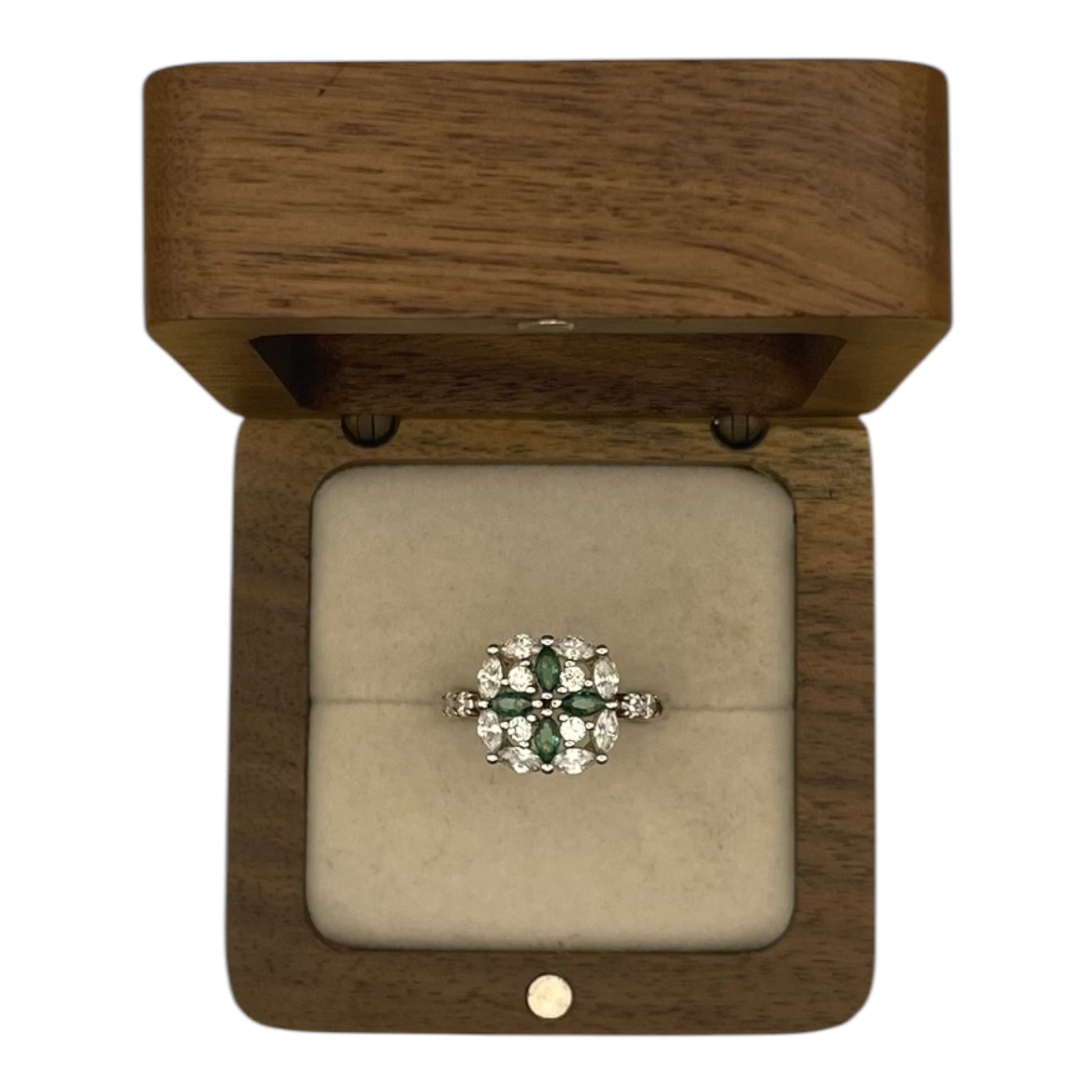 • Piedra central: esmeralda de corte marquesa, de 0.17 ct
