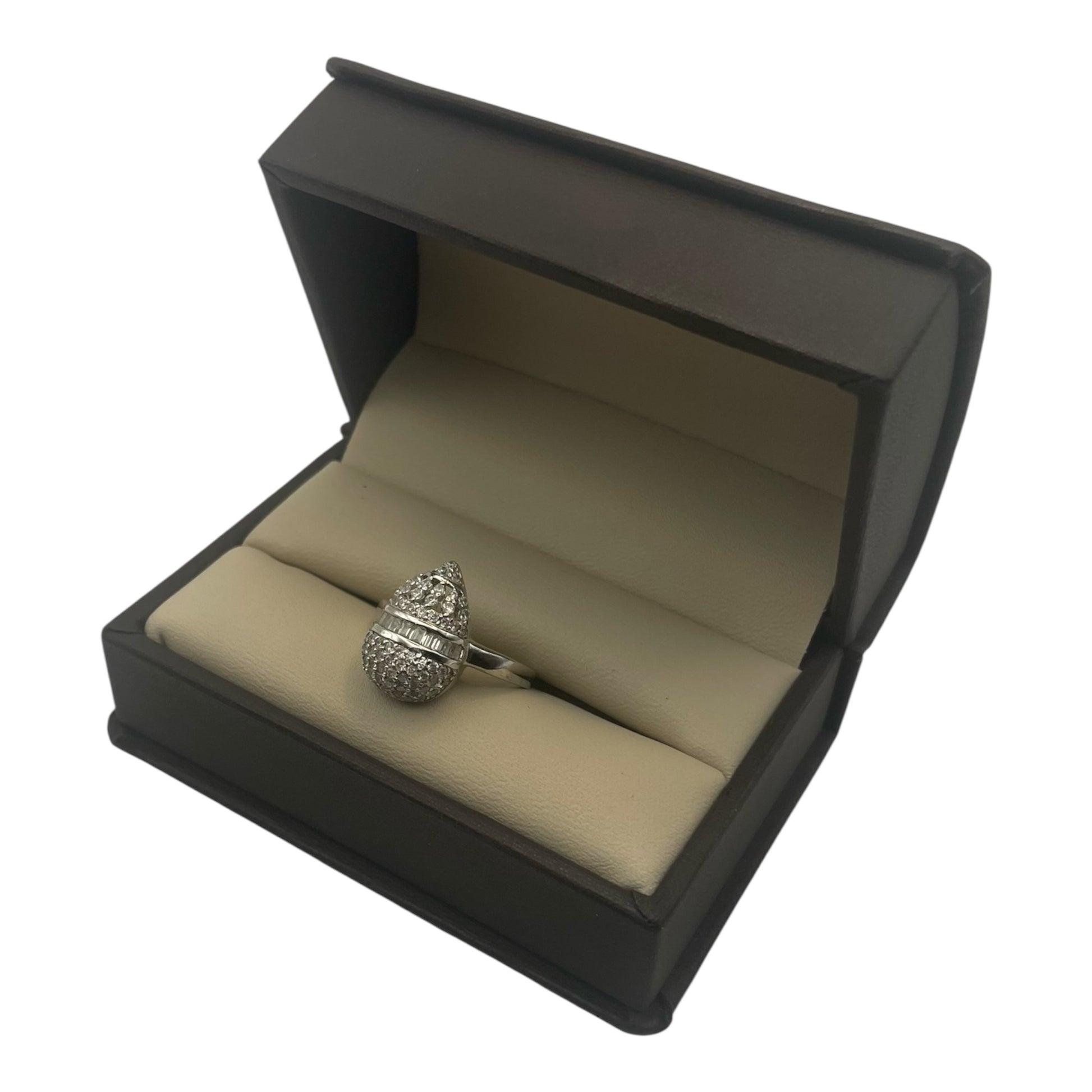 El anillo está adornado con zafiro blancos de corte baguette, sumando un total de 1.18 quilates, lo que añade un brillo adicional y refinamiento a todo el diseño. Las piedras en estilo pavé resaltan la pureza y la transparencia de cada topacio, creando una combinación armoniosa con la piedra central y otorgando al anillo un aspecto extravagante y moderno.