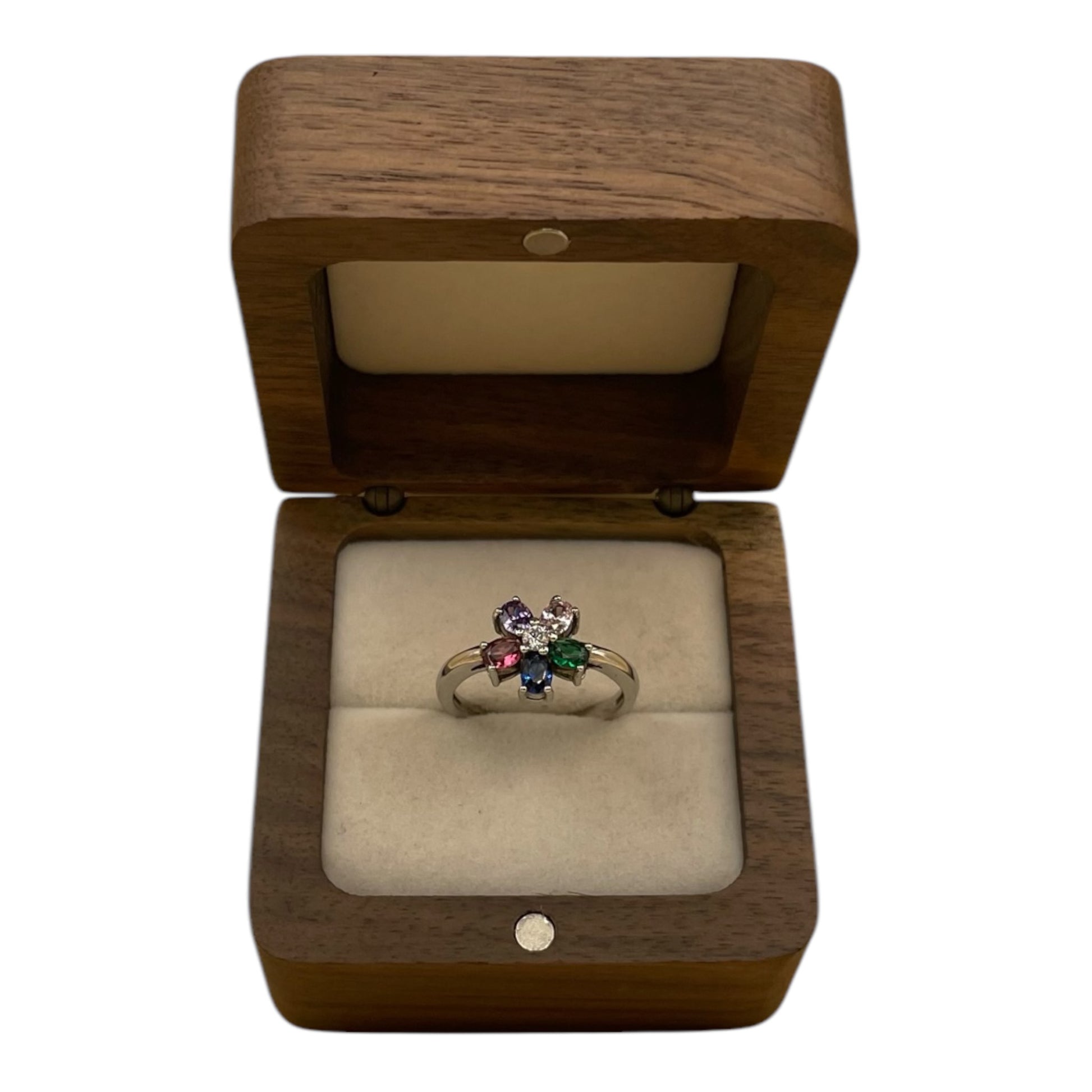Les presentamos un exquisito anillo de la colección «Flor Moderna», creado para resaltar la vibrante belleza de las piedras semipreciosas en un diseño contemporáneo y sofisticado. Este anillo está hecho en forma de flor, decorado con topaz rosa, citrino, amatista, peridoto y topaz blanco de talla gota, que suman un total de 0,87 ct. Cada piedra ha sido cuidadosamente seleccionada y engastada para formar una armoniosa composición de colores vivos y un brillo deslumbrante que captura la esencia del estilo moderno y elegante.