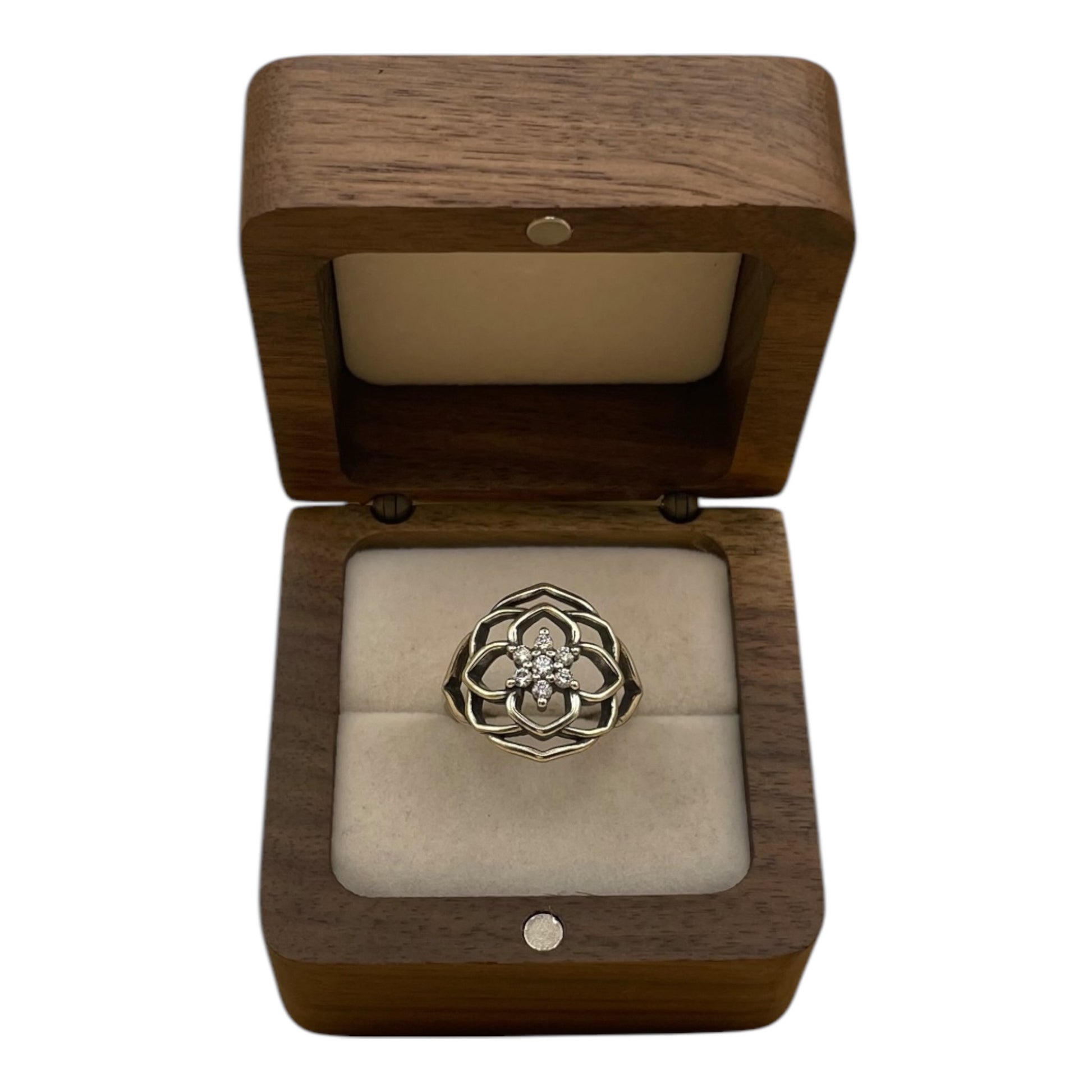 El diseño en forma de flor está elaborado en plata pura de ley 925, garantizando su durabilidad y nobleza. Cada pieza es hecha a mano, asegurando una calidad excepcional y una atención meticulosa a cada detalle, convirtiéndola en un símbolo de estilo refinado y buen gusto.