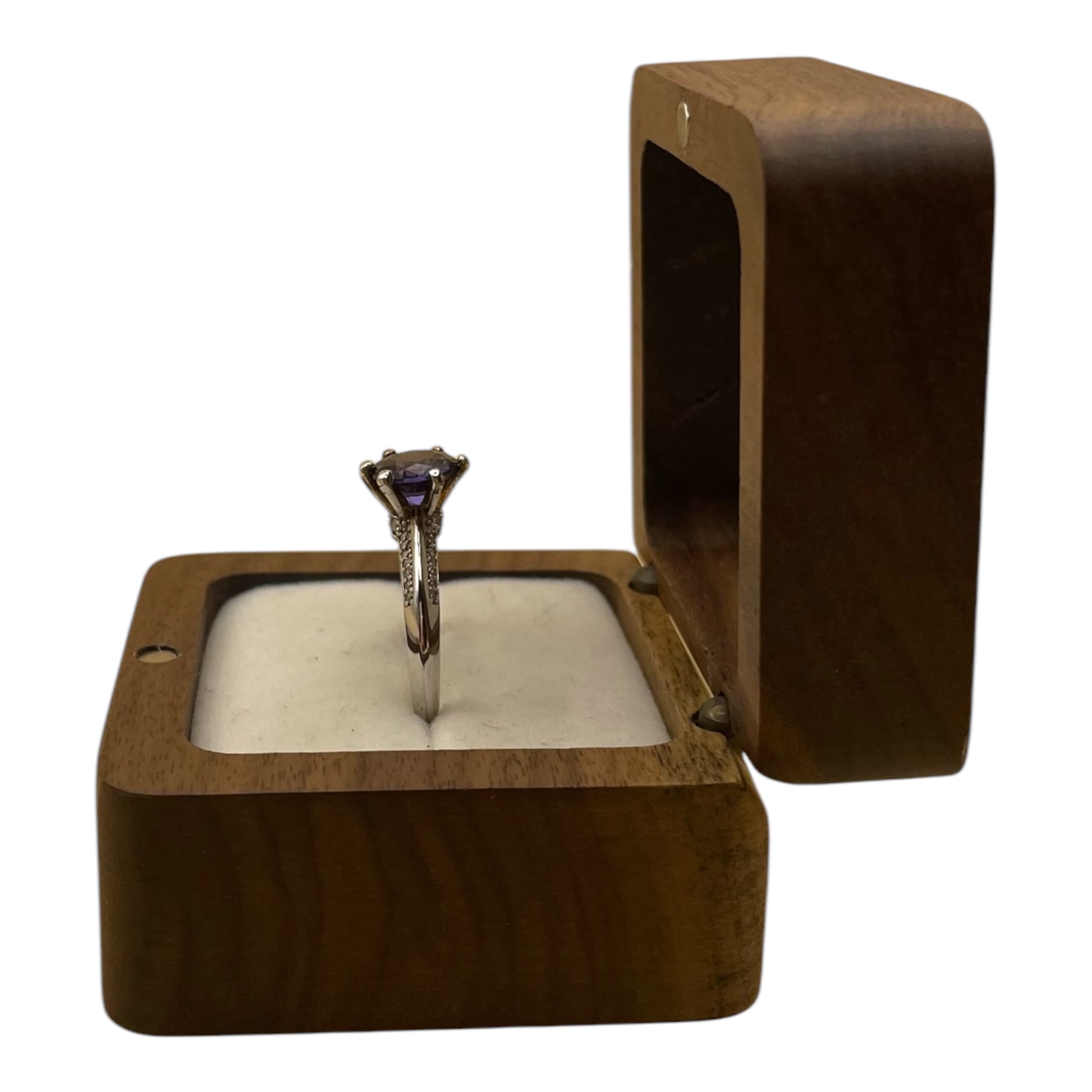 El anillo está adornado con zafiros blancos en estilo pavé, sumando un total de 0,37 quilates, lo que añade un brillo adicional y refinamiento a todo el diseño. Los zafiros en estilo pavé resaltan la pureza y la transparencia de cada piedra, creando una combinación armoniosa con la amatista central y otorgando al anillo un aspecto art déco elegante y moderno.