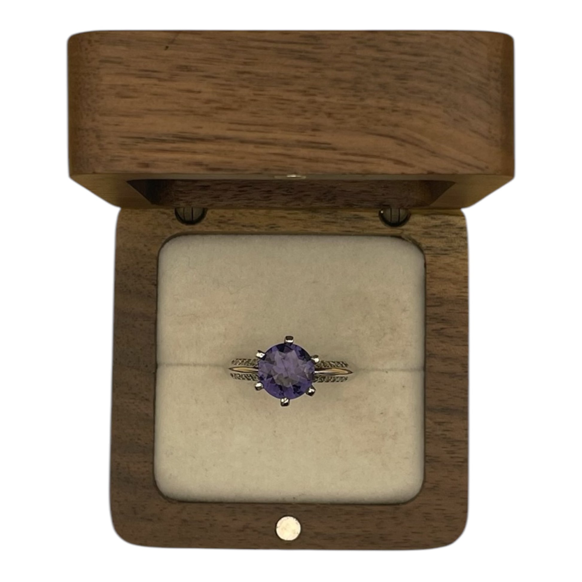 Le presentamos un exquisito anillo de la colección «Art Deco Solitaire», realizado en un exclusivo estilo Art Deco con elementos de elegancia clásico-moderna. En el centro de esta joya se encuentra una amatista de corte «Redondo» de 1,25 quilates, que irradia un intenso tono azul marino y un brillo incomparable, convirtiéndose en el principal acento de la pieza.
