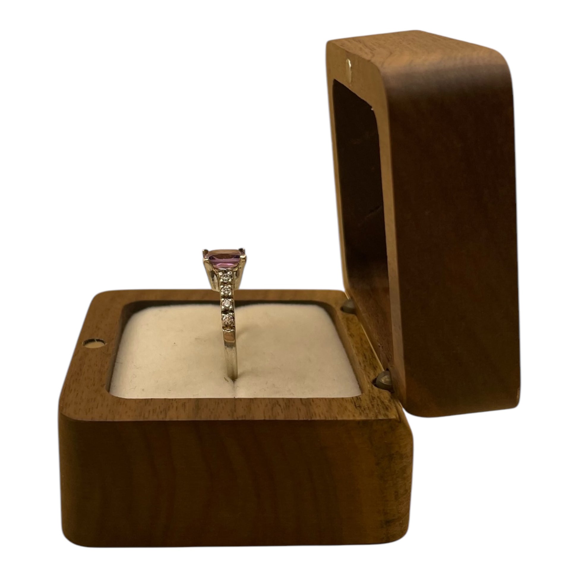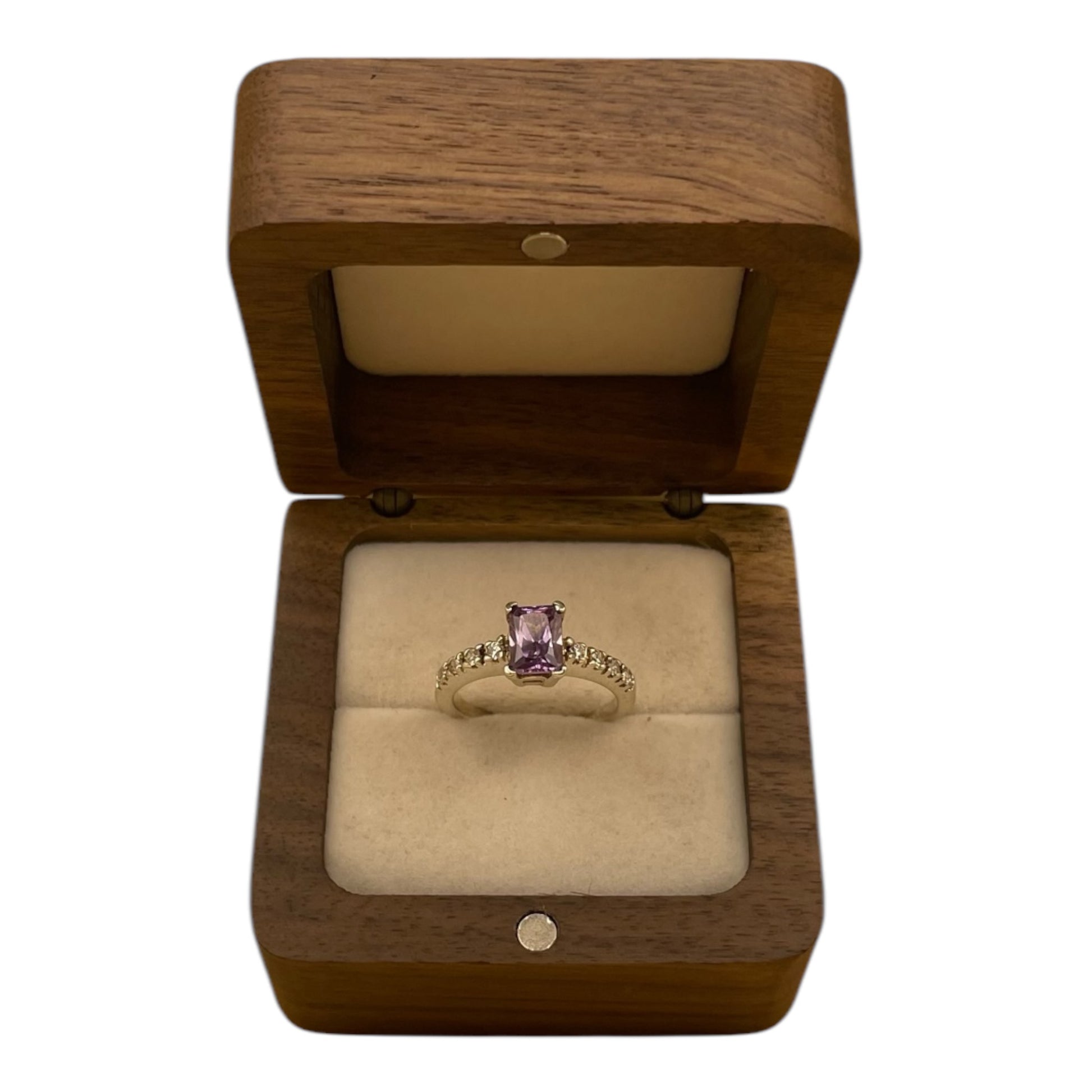 El anillo está adornado con amatistas brasileñas y diamantes blancos, sumando un total de 0,24 quilates, lo que añade un brillo adicional y refinamiento a todo el diseño. Los adornos resaltan la pureza y la transparencia de cada piedra, creando una combinación armoniosa con la amatista central y otorgando al anillo un aspecto clásico, elegante y chic.