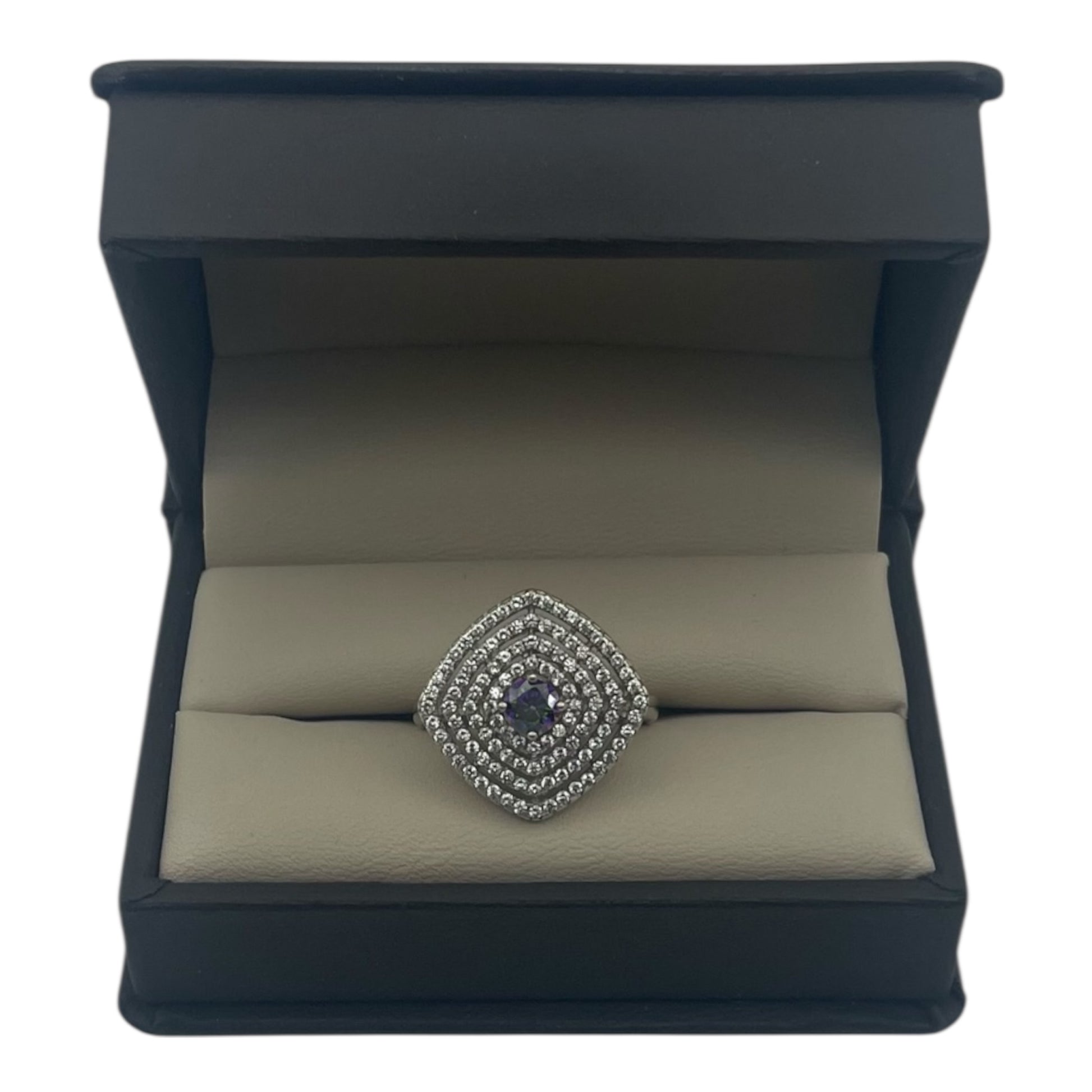 El diseño en estilo Pavé resalta un topacio místico como piedra central — una joya que refleja matices cambiantes de luz y energía. Su brillo está realzado por un delicado engaste de zafiros blancos, creando un equilibrio armonioso entre misterio y pureza.