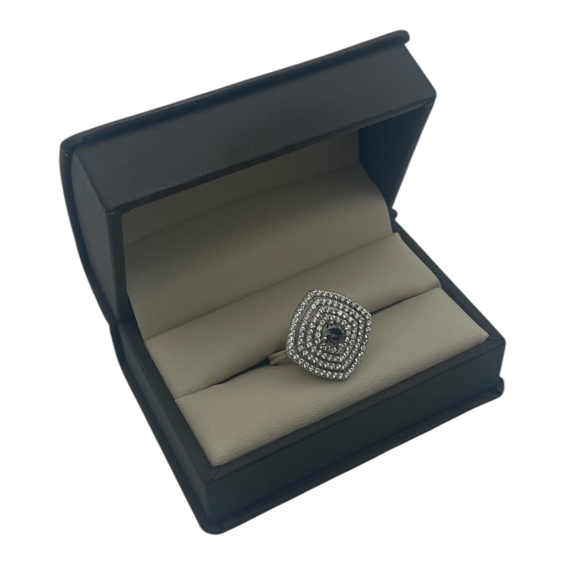 Anillo Exclusivo de Plata Pura con Topacio Místico y Zafiros Blancos – Estilo Pavé Francés