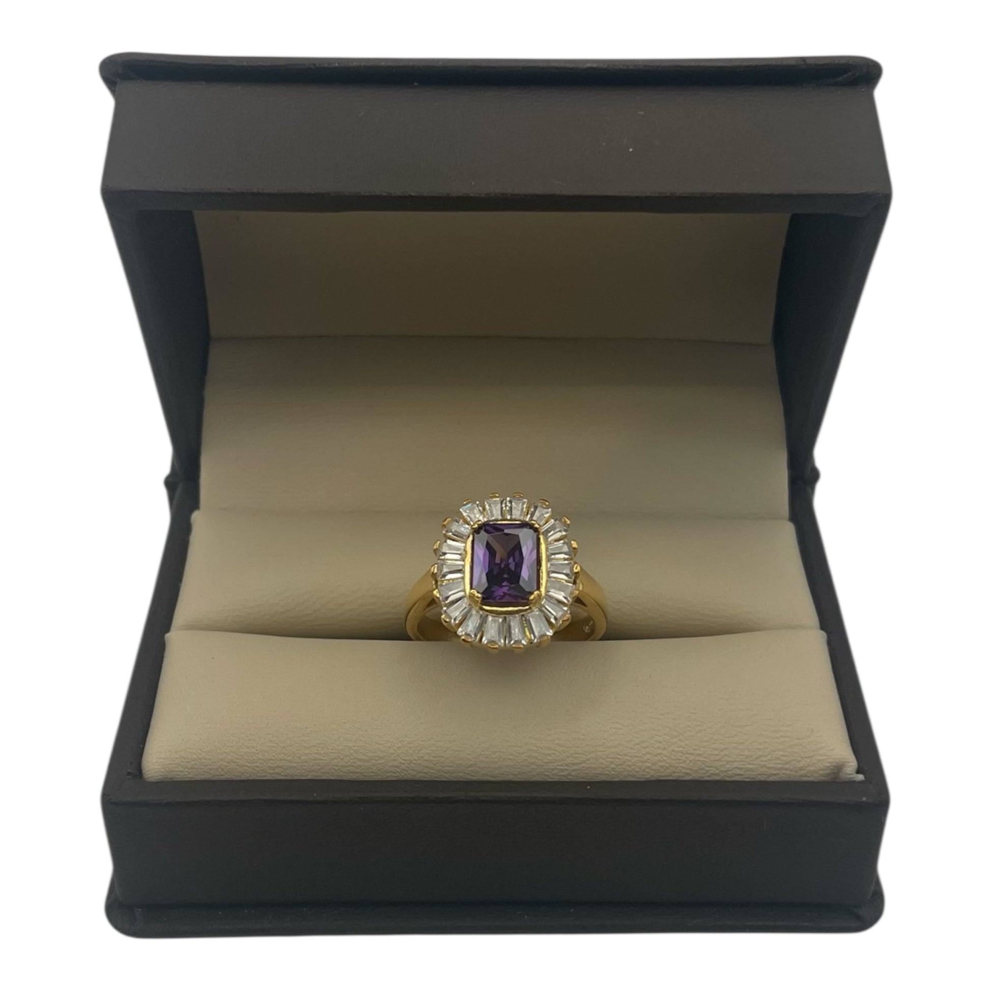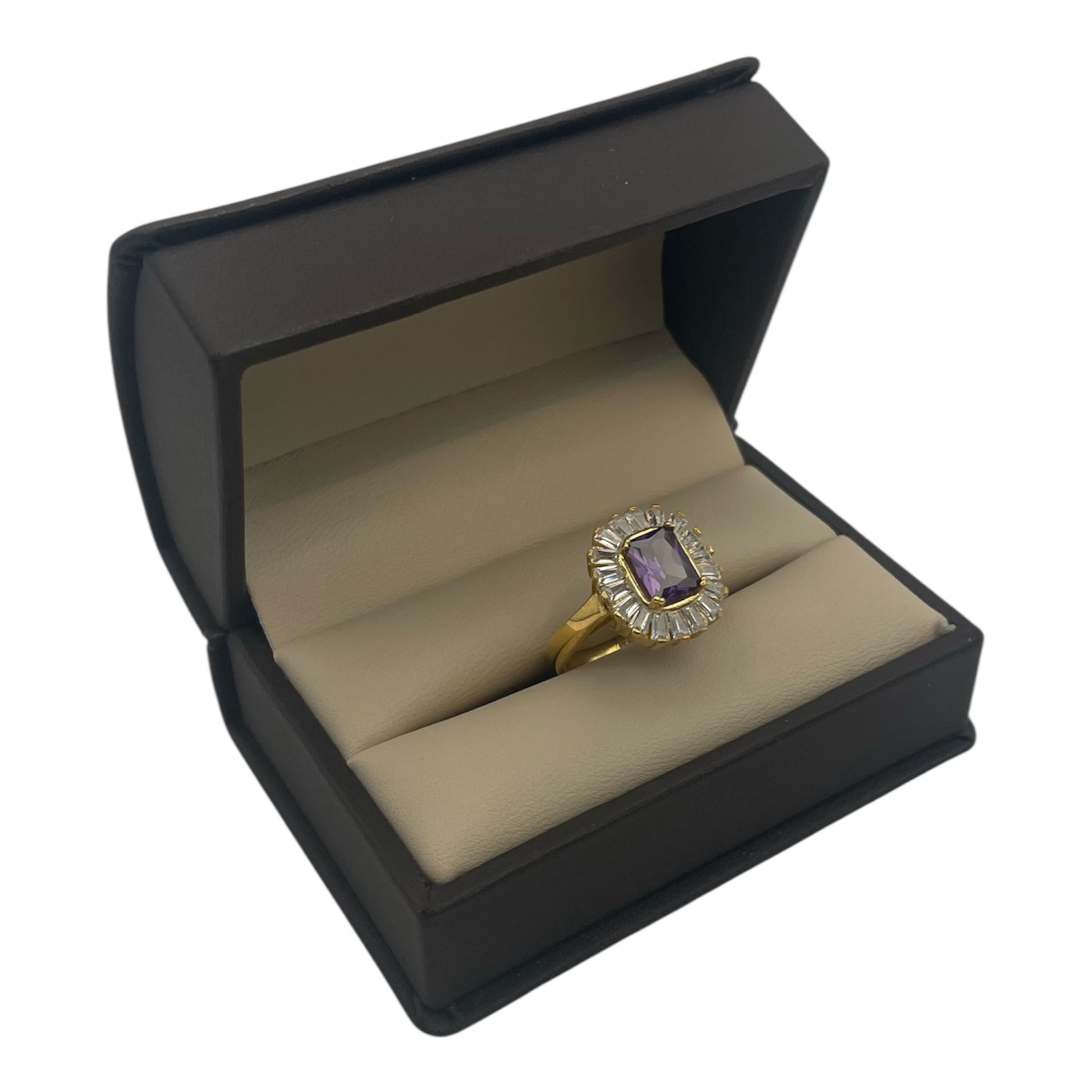 En el centro, un raro amatista brasileño de 2.25 quilates con talla esmeralda. Su tono violeta intenso posee una profundidad casi imperial — revelando lentamente su misterio con matices de madurez y gracia.