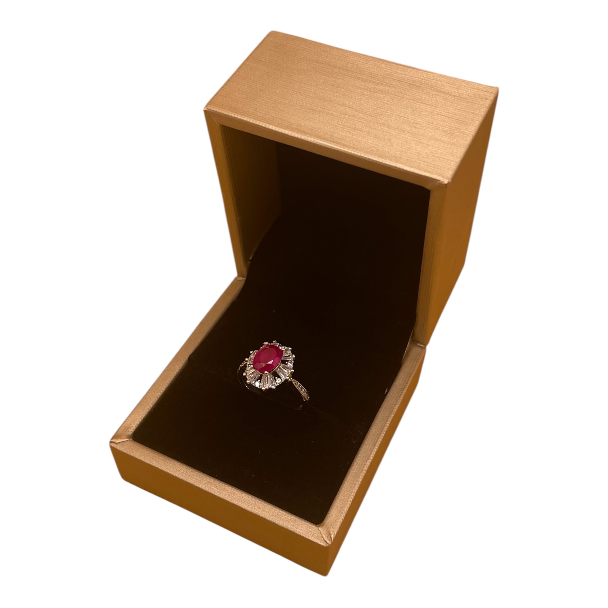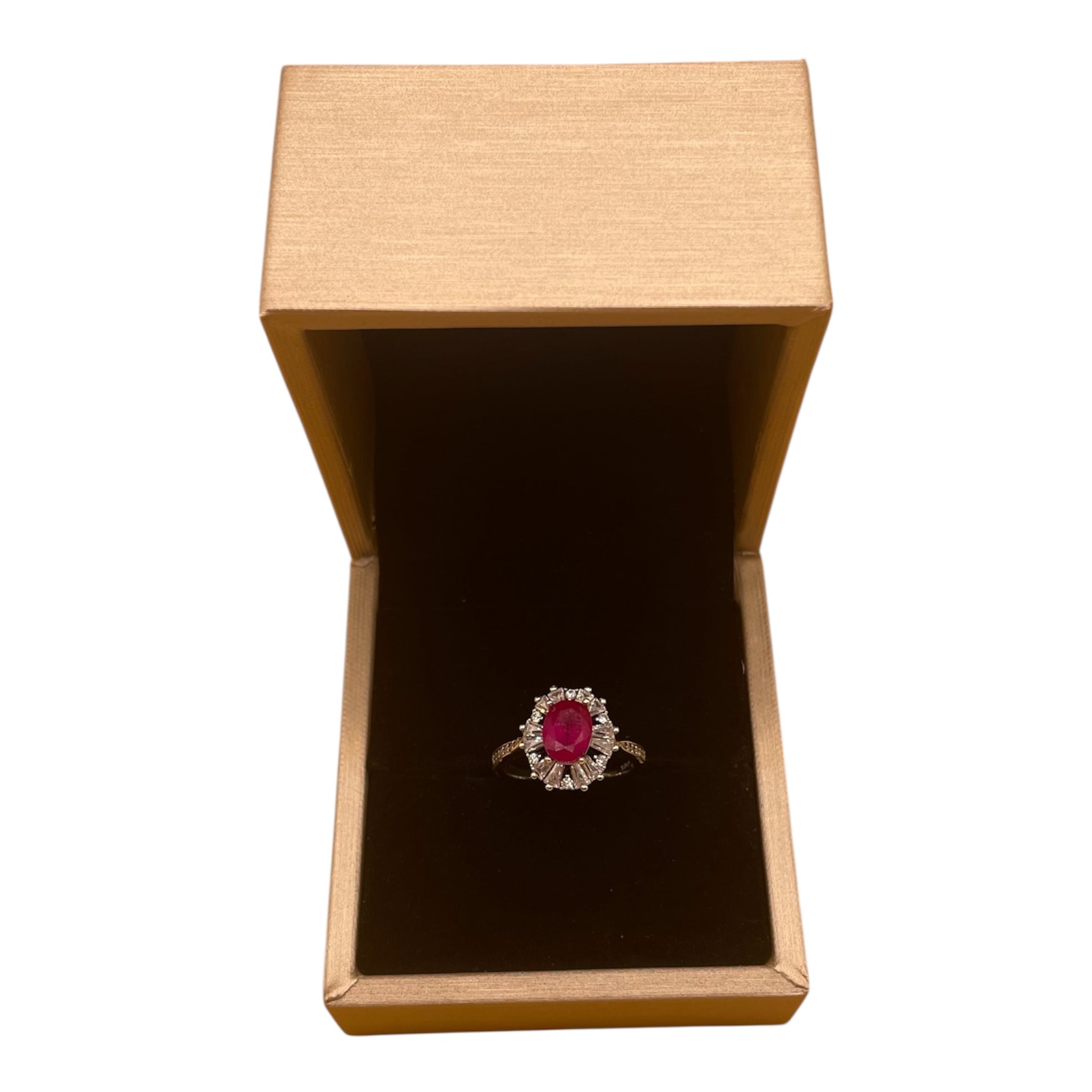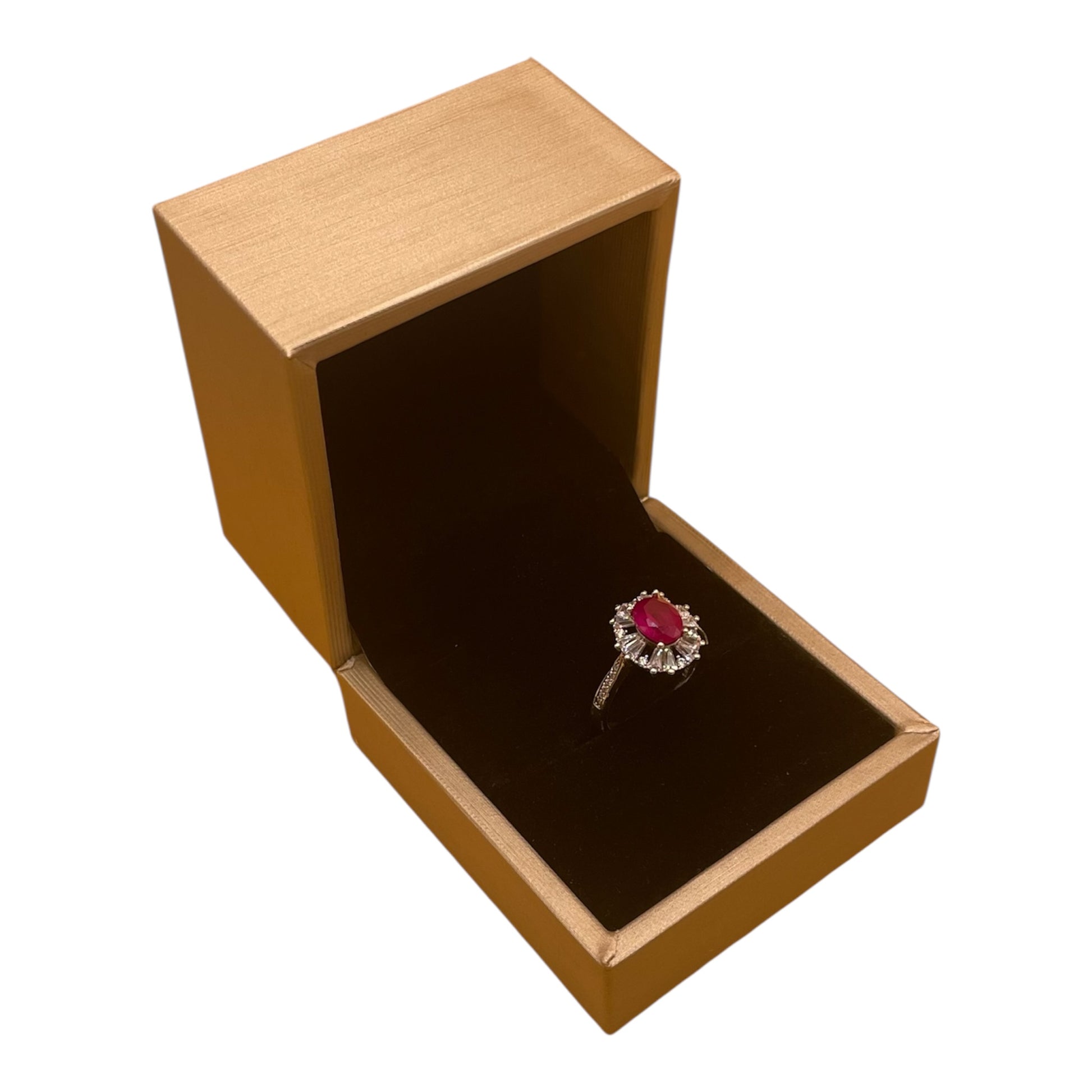 En el centro, un majestuoso rubí rojo de corte oval — 1.56 ct de fuego puro — abrazado por la elegancia del estilo francés Pavé.