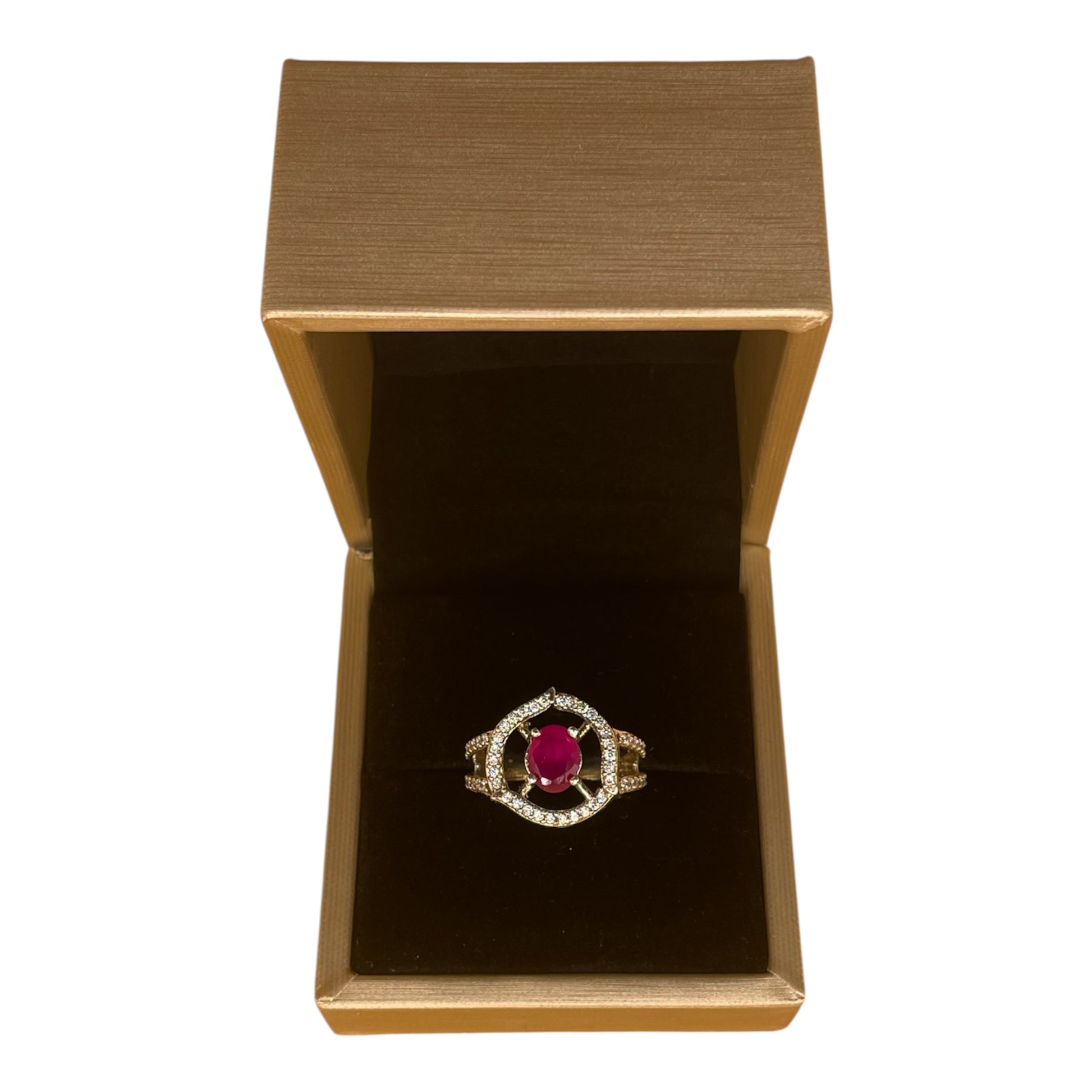 A cada lado, zafiros blancos en cortes brillante construyen un juego arquitectónico de luz, equilibrio y sofisticación, resaltando el rojo profundo del rubí y acentuando su presencia majestuosa.