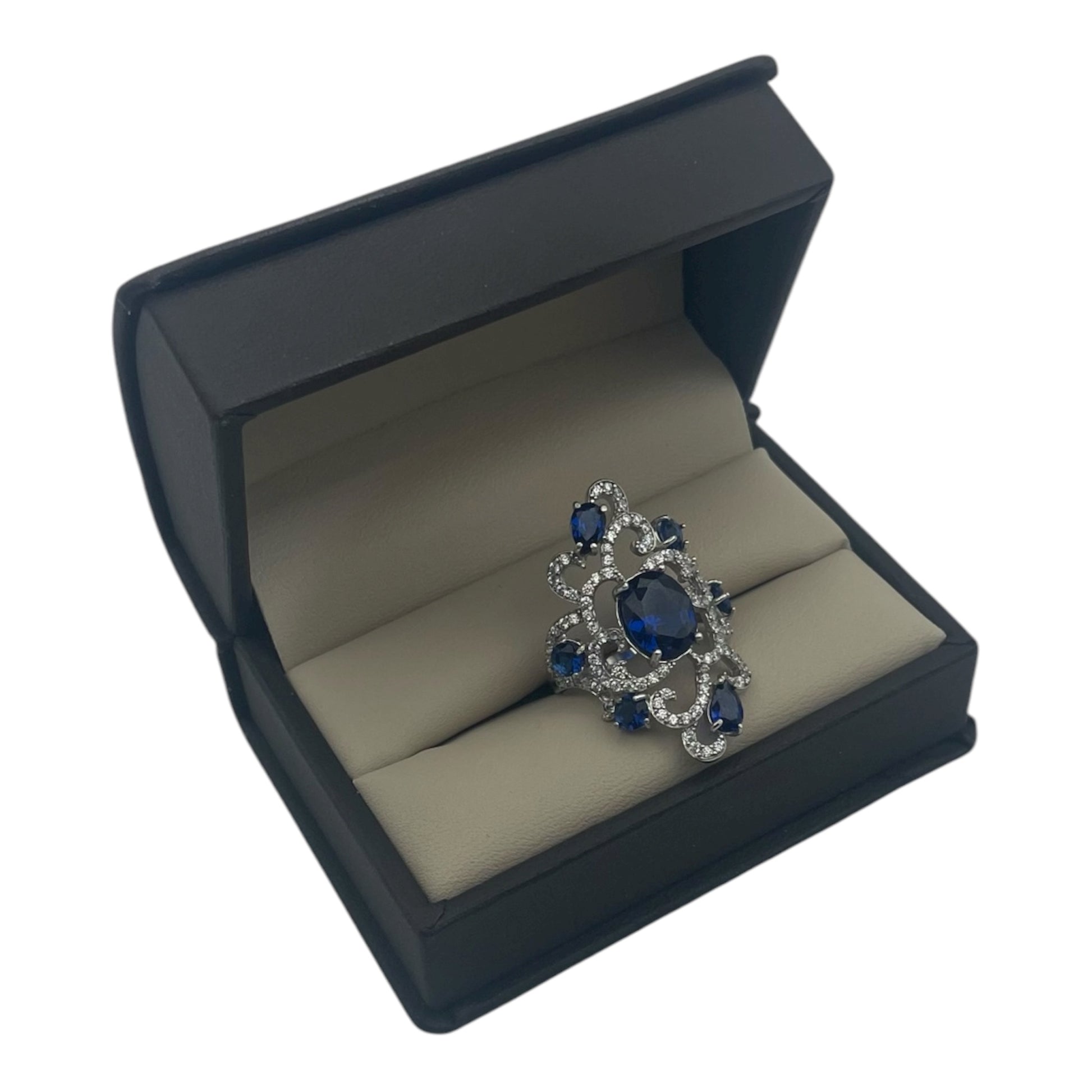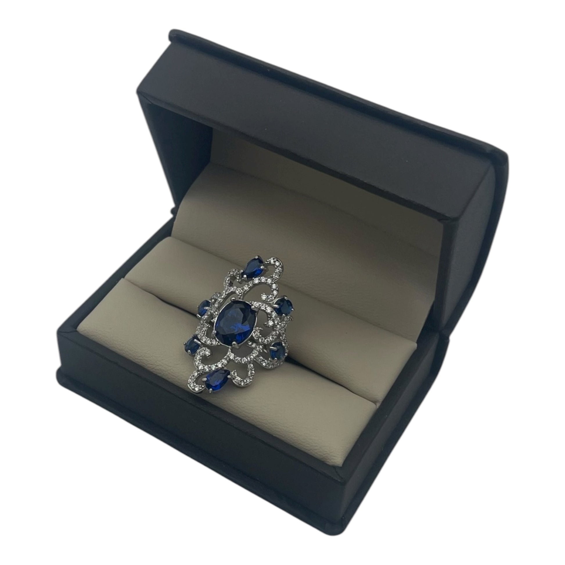 Zafiros azules reales y zafiros blancos se combinan en una armonía de luz y color, creando una magia de tres cortes diferentes, con un zafiro majestuoso en el centro.