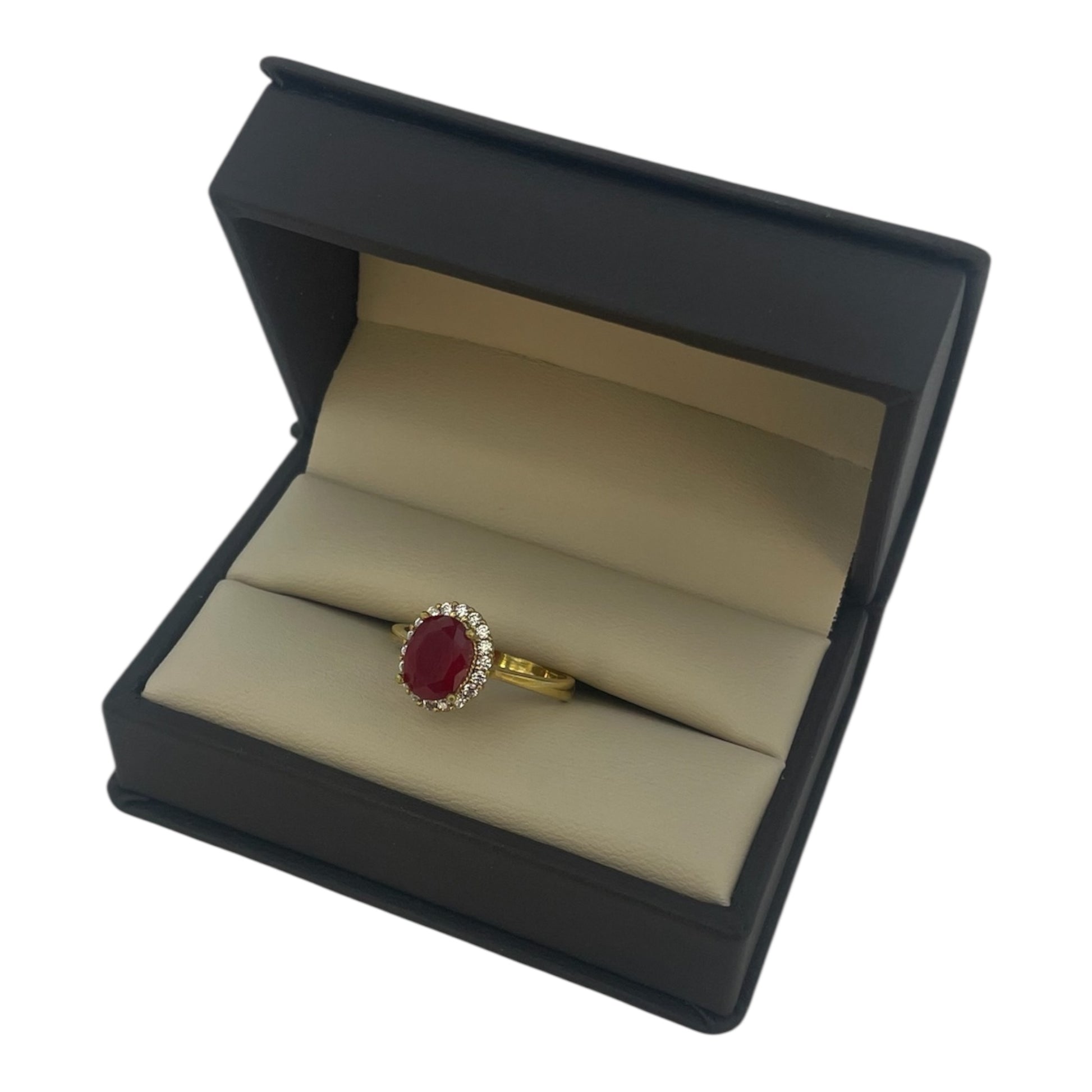 En el centro, un rubí natural de 2.18 quilates con talla ovalada domina la composición con su color rojo profundo — símbolo eterno de la pasión, el poder y la madurez espiritual.