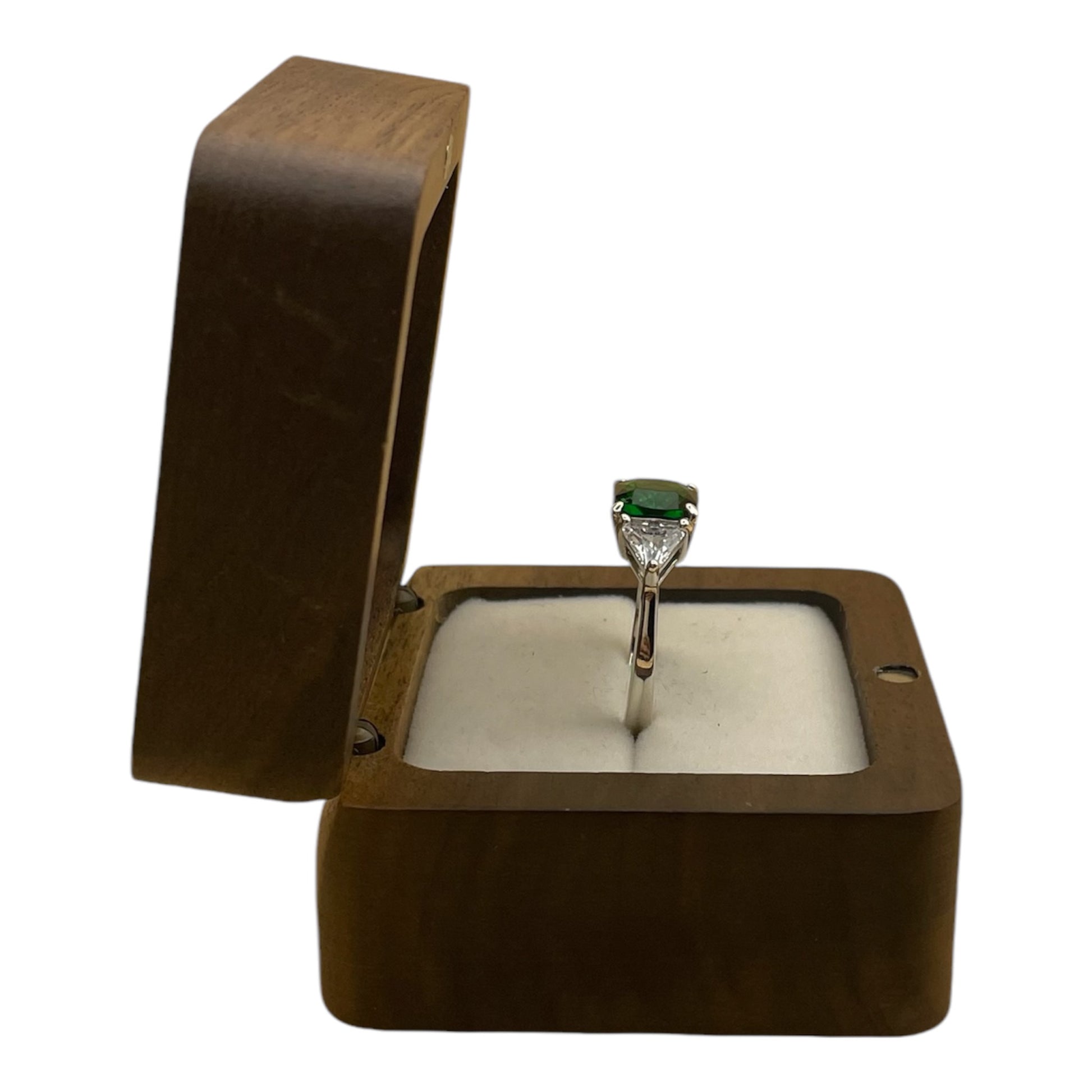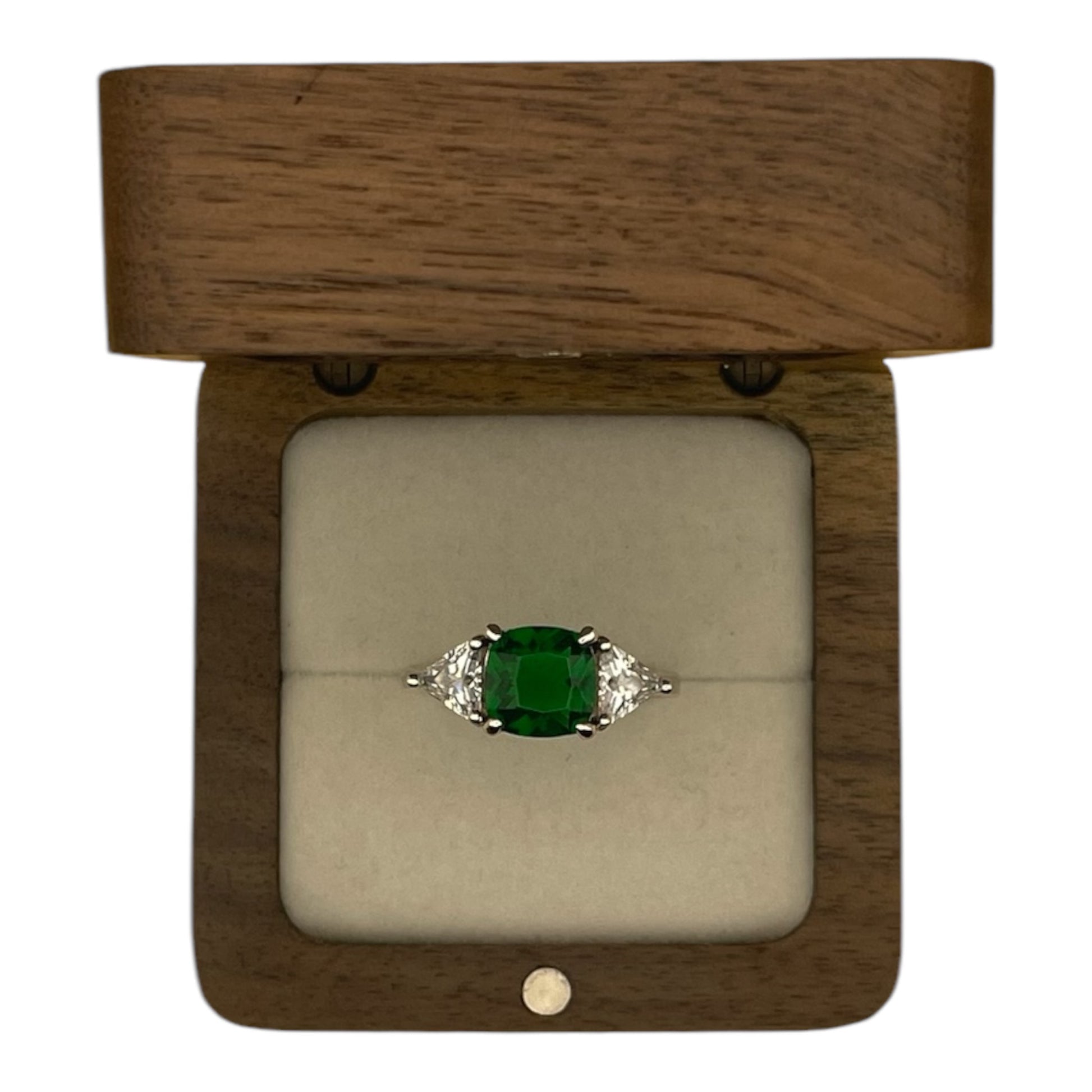 - La piedra central es una esmeralda de corte «Cushion» de 3.15 quilates, que le da al anillo un aspecto clásico y refinado.
