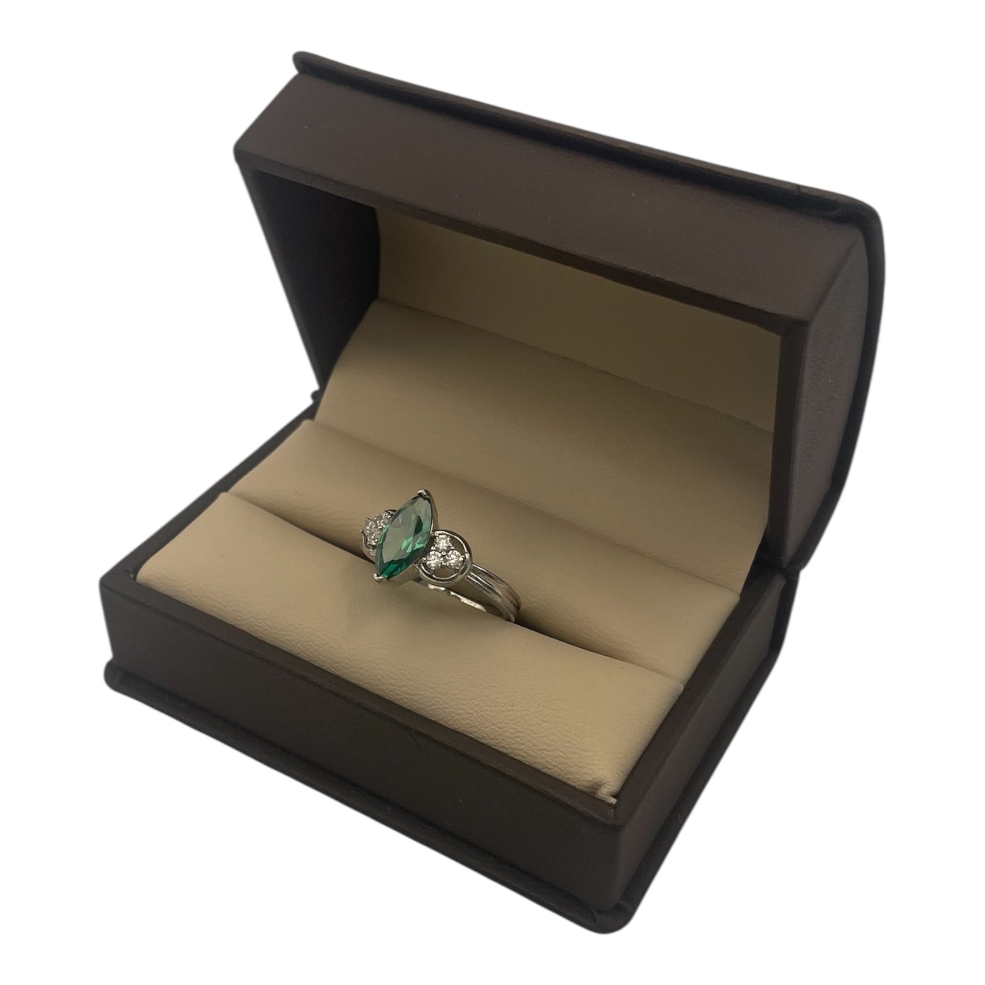 En el centro del diseño brilla un majestuoso turmalina verde de 1.95 quilates, talla marquesa. Alargado, vibrante, casi hipnótico — como un sendero del bosque envuelto en el silencio del amanecer.