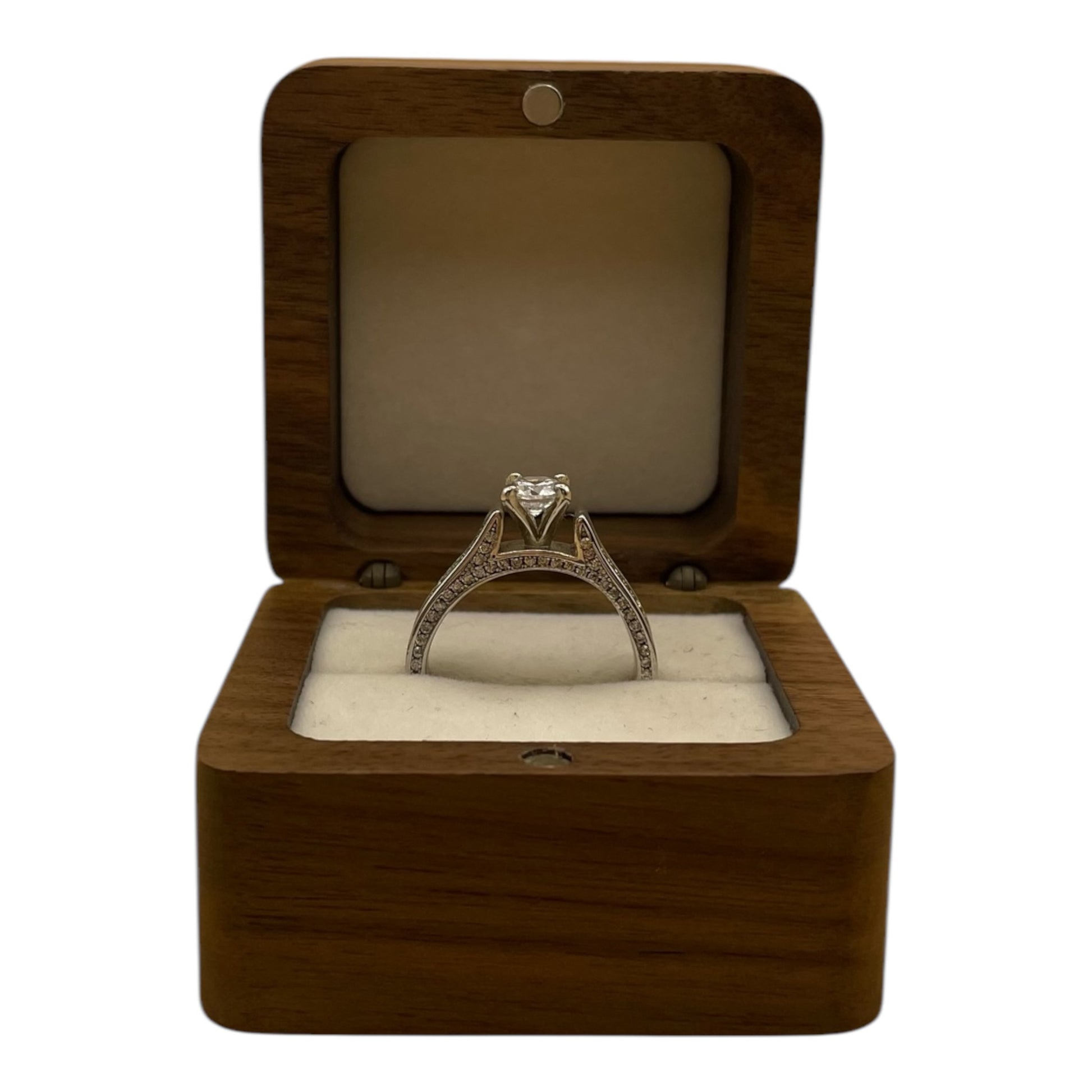 El anillo está rodeado de zafiros blancos en estilo pavé, sumando un total de 0,12 ct, lo que añade un brillo adicional y una sofisticación al diseño completo. El estilo pavé resalta el resplandor y la transparencia de los zafiros, creando una armoniosa combinación con la piedra central y otorgando al anillo un aspecto refinado.