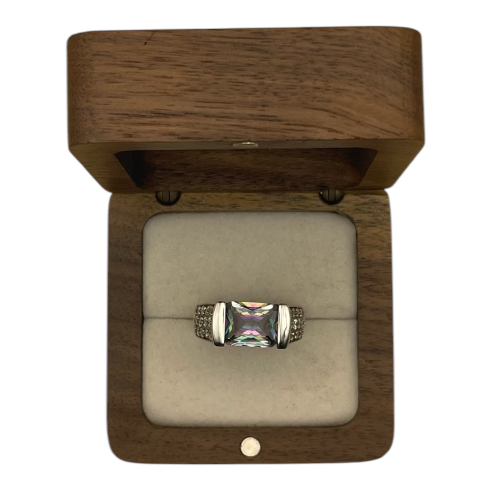 Les presentamos un exquisito anillo de la colección «Noches Árabes», creado para evocar la magia y el misterio de las noches orientales en un diseño moderno y sofisticado. En el centro de esta joya se encuentra un topacio místico de talla esmeralda de 2,40 ct, que irradia un espectro de colores hipnóticos y fascinantes. Los bordes están adornados con zafiros blancos en estilo pavé, realzando su brillo y elegancia. Este anillo macizo ha sido diseñado para uso diario, combinando un estilo elegante y exclusivo que lo hace ideal para cualquier ocasión.