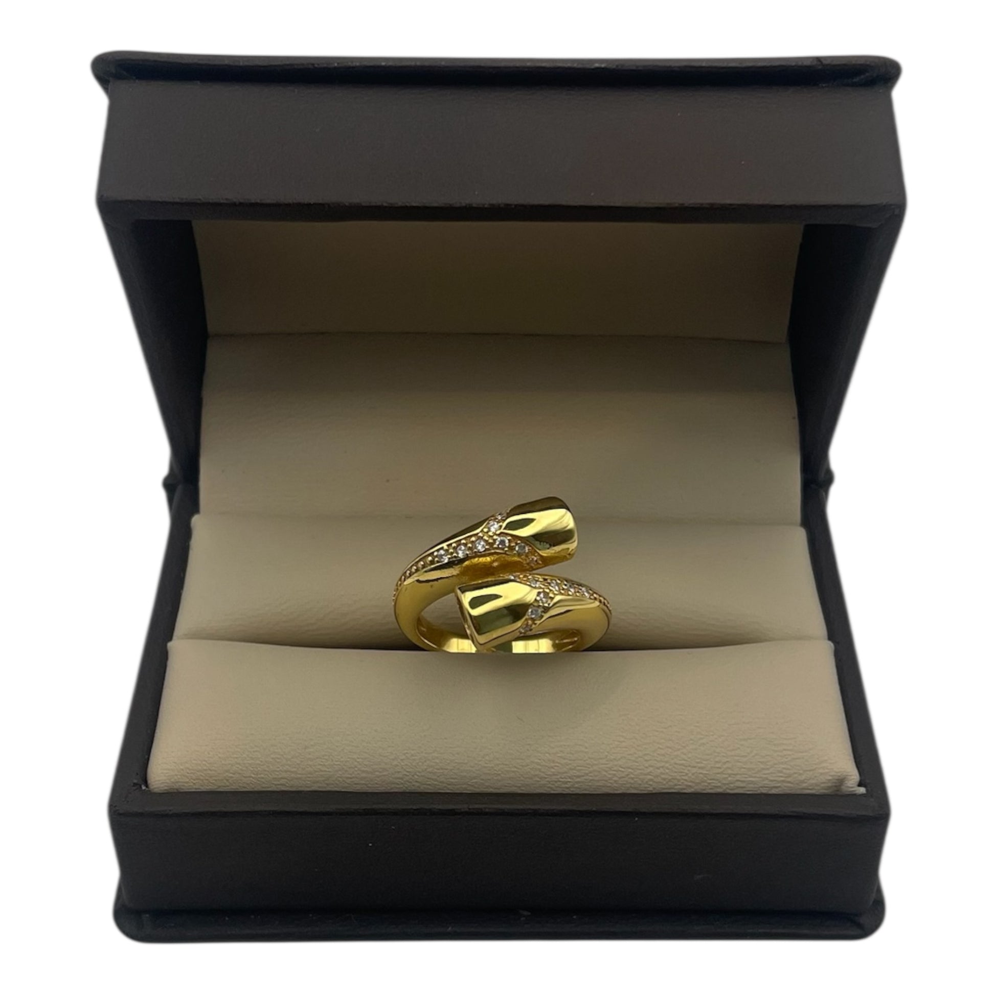El anillo está elaborado a mano en plata 925 con un delicado baño de oro amarillo de 18 quilates. El diseño, moderno y elegante, abraza la historia con sutileza y sofisticación.