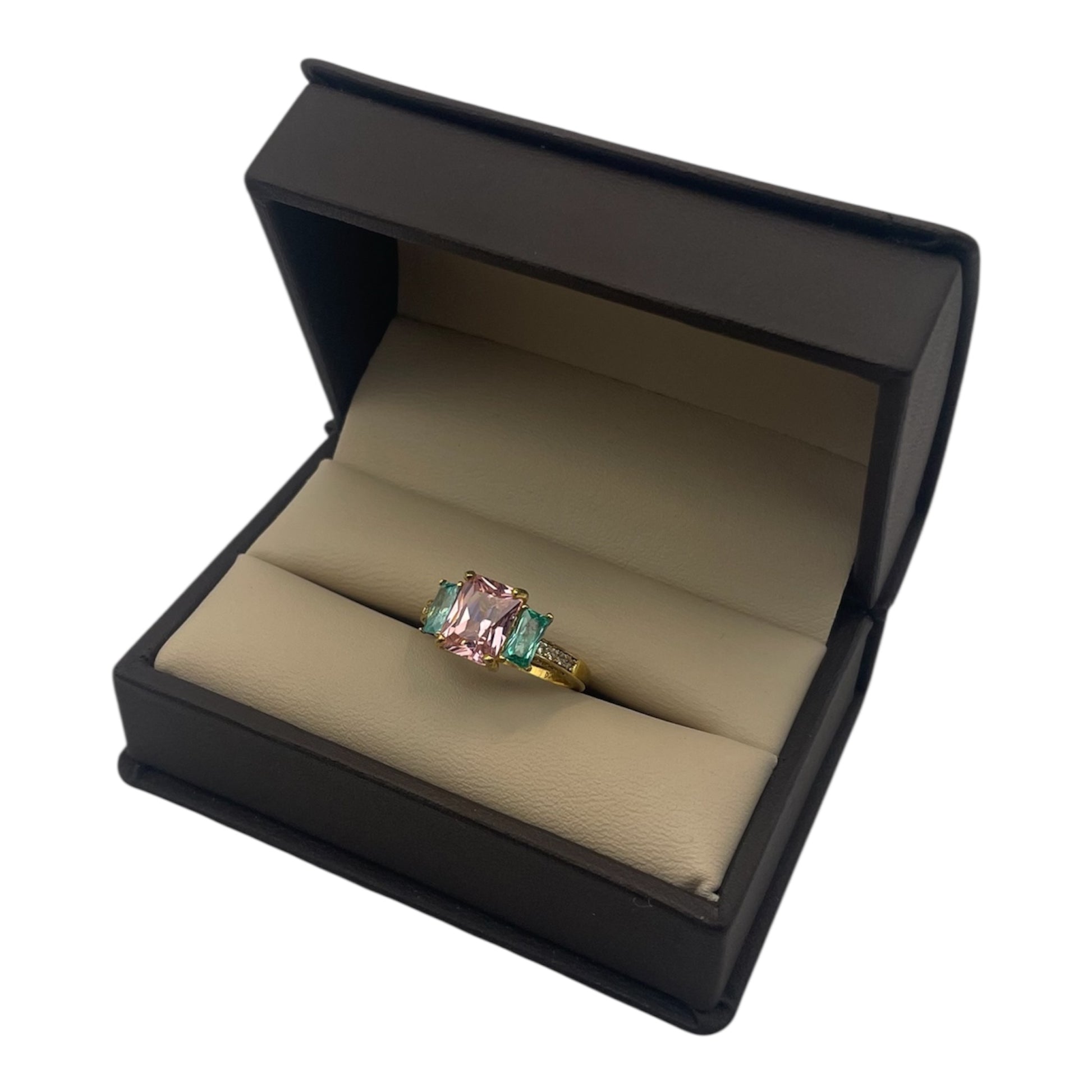A sus lados, dos turmalinas verdes talla baguette, reflejan el crecimiento, la esperanza y la fuerza del camino recorrido.